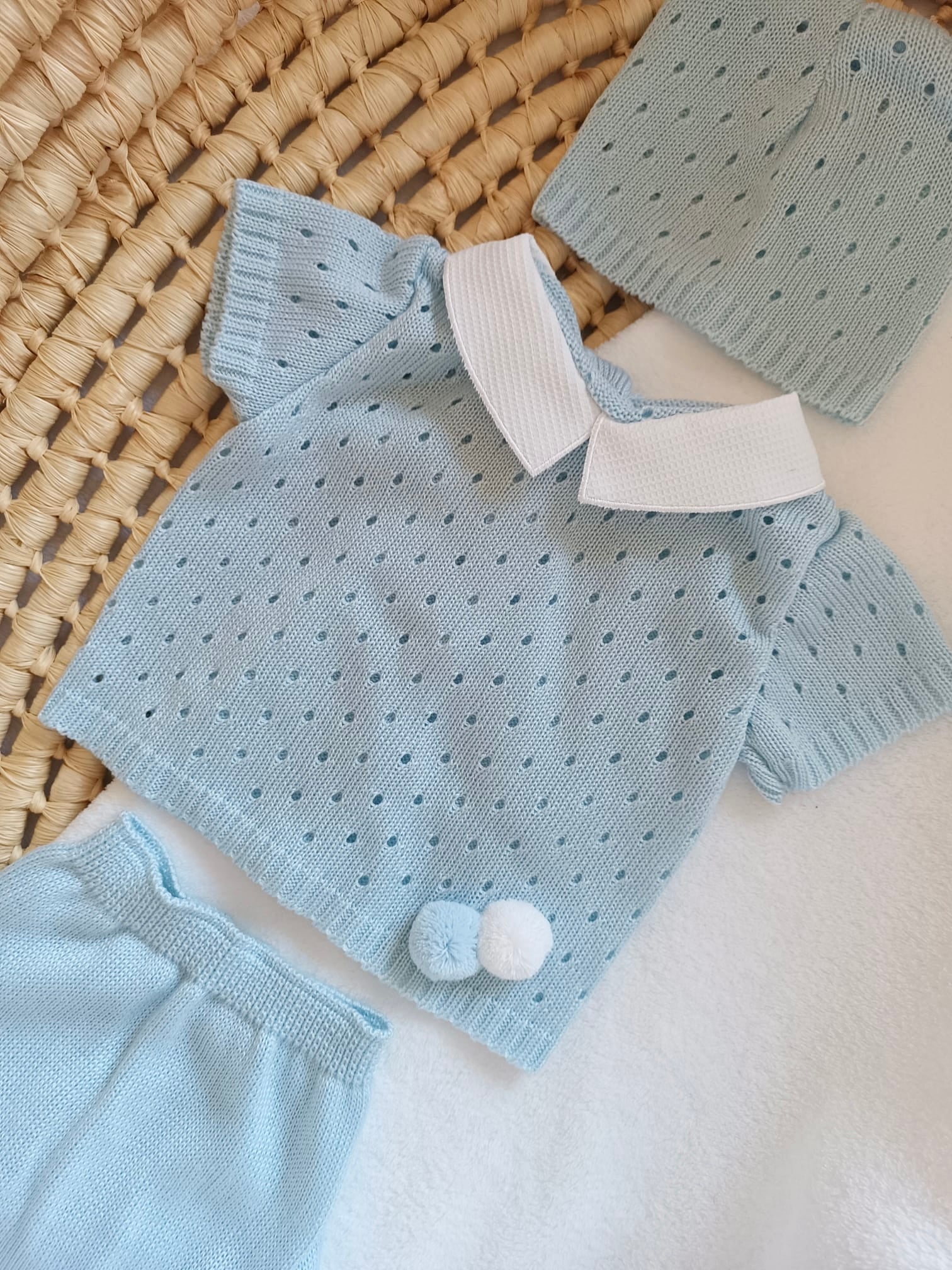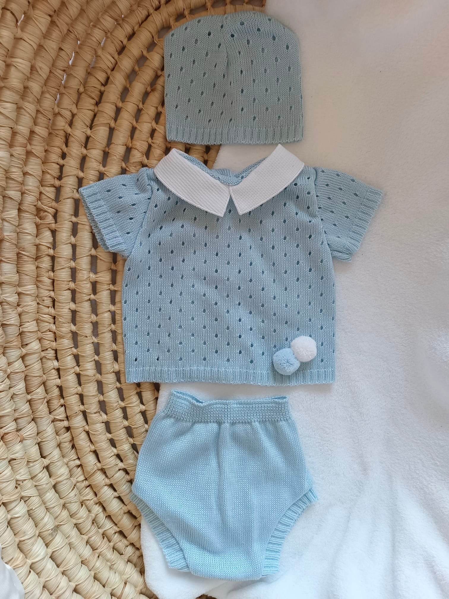 Ensemble complet naissance bleu ciel avec pompom 0/3 mois -