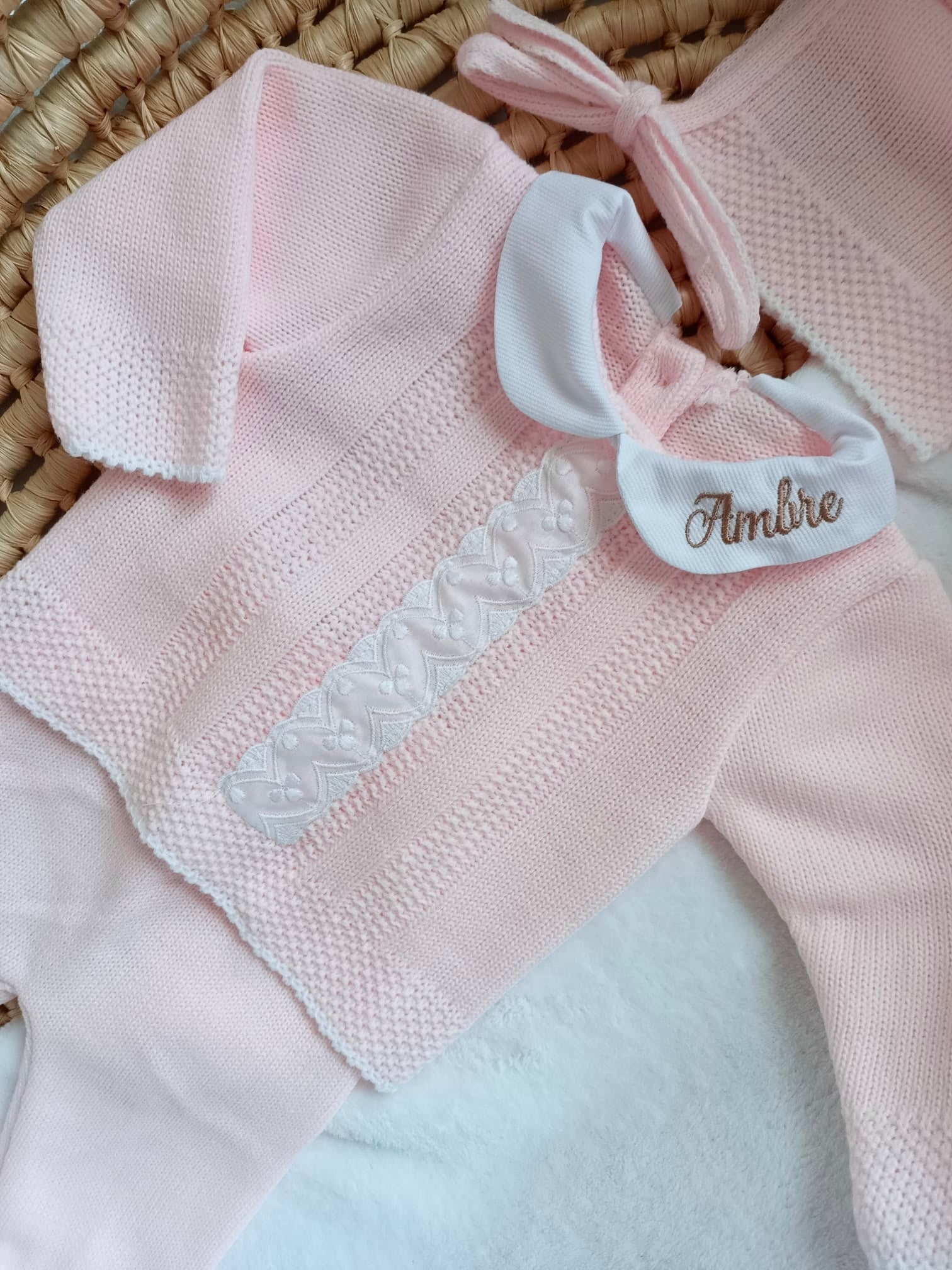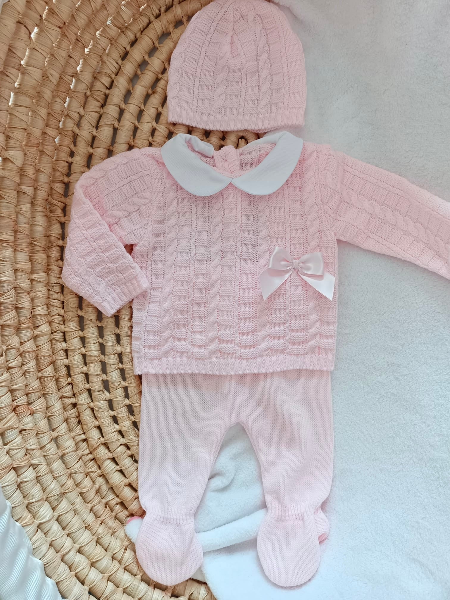 Ensemble complet naissance vieux rose avec détails noeud blanc 0/3 mois -