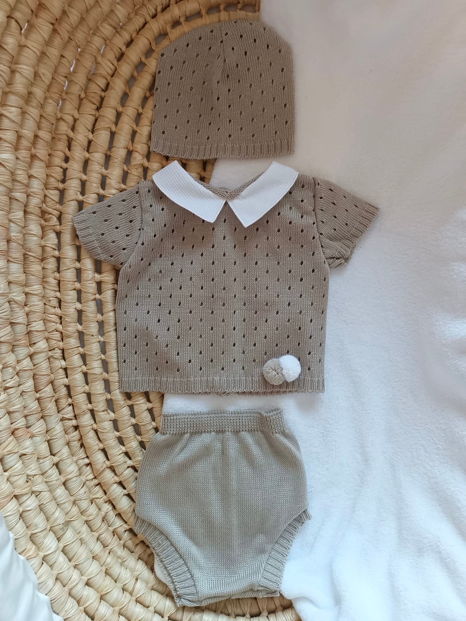 Ensemble complet naissance marron avec pompom 0/3 mois -