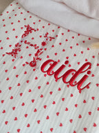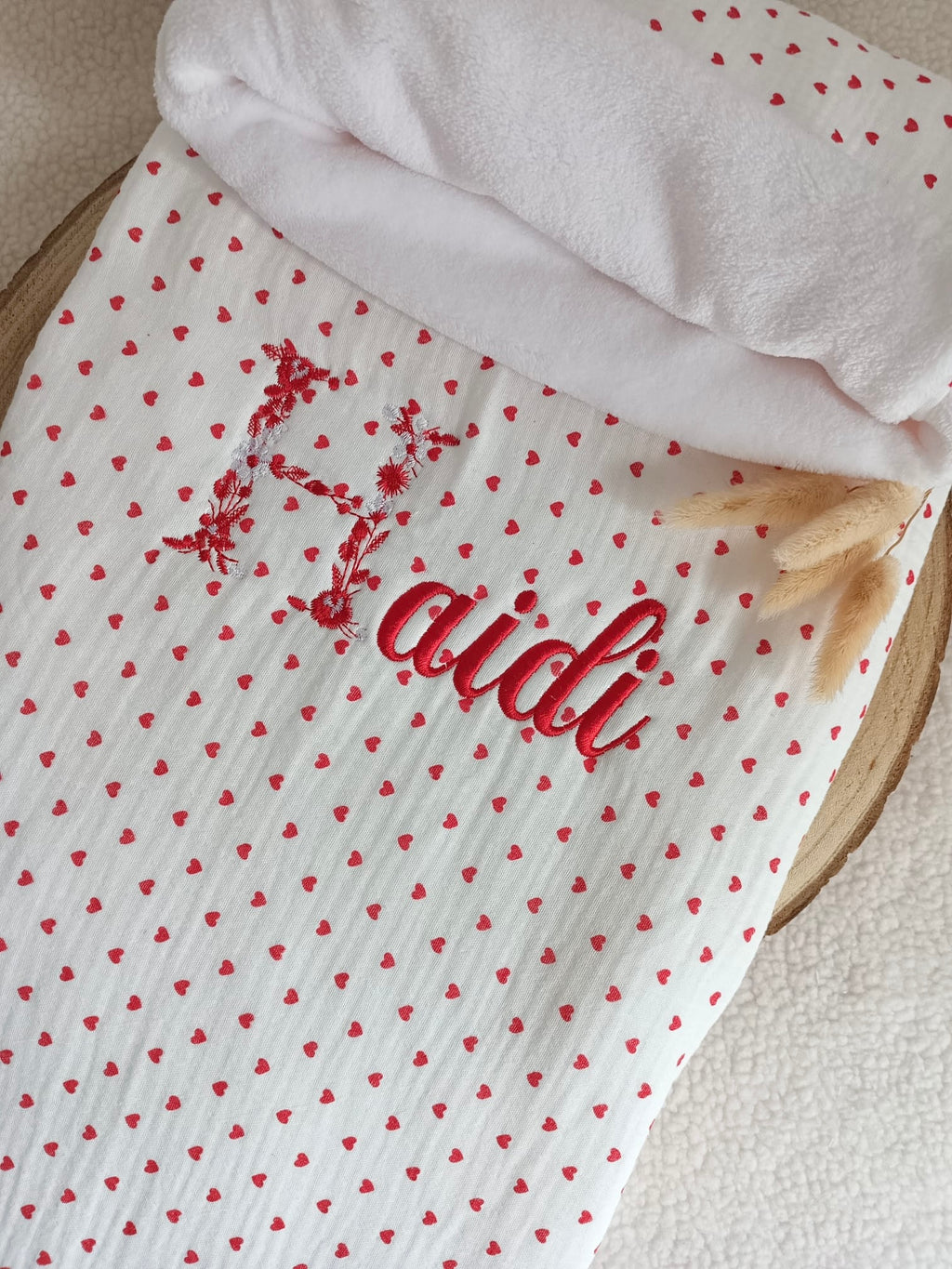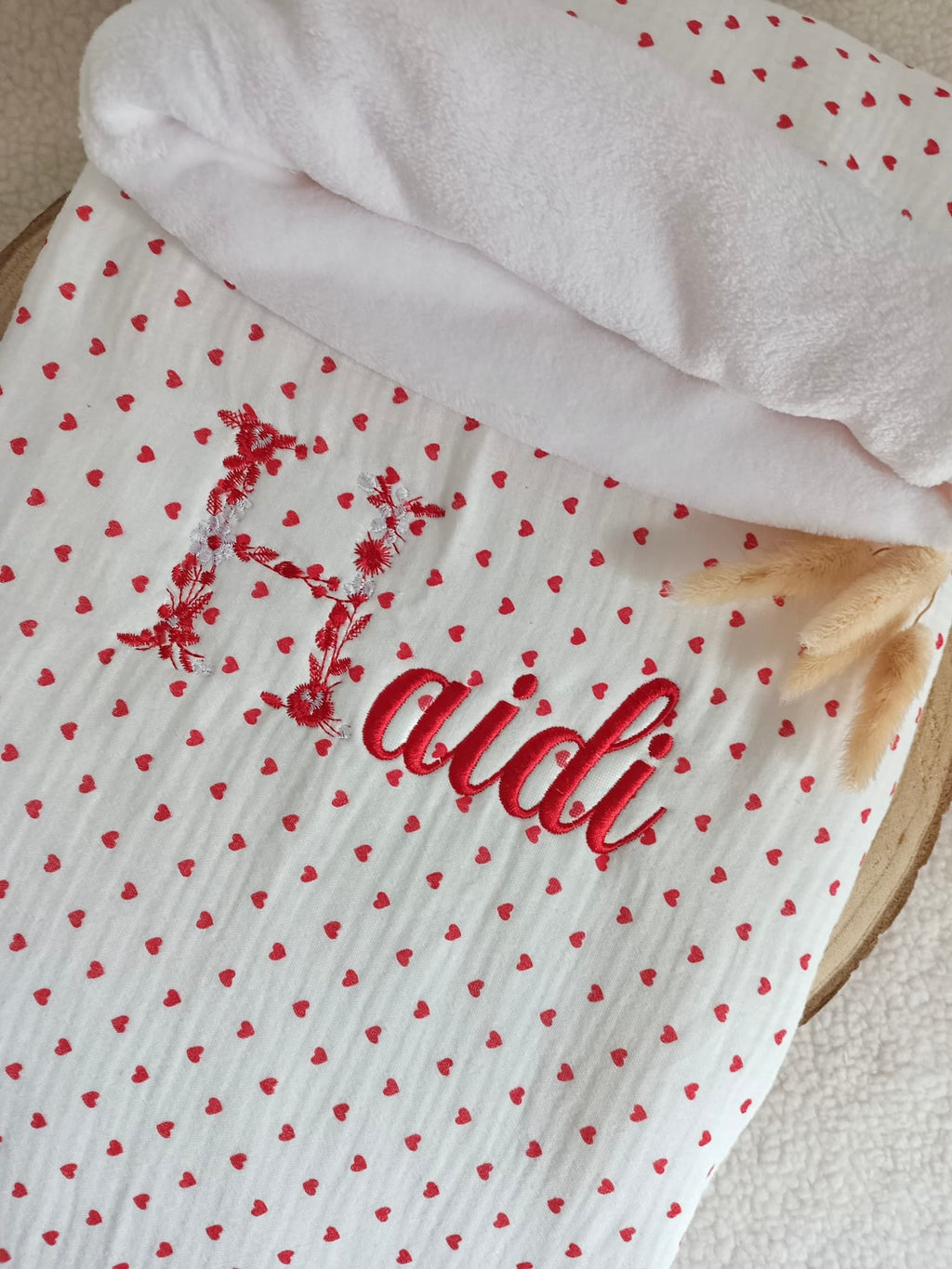 Couverture en gaze de coton blanc et polaire avec cœurs rouge - personnalisable -