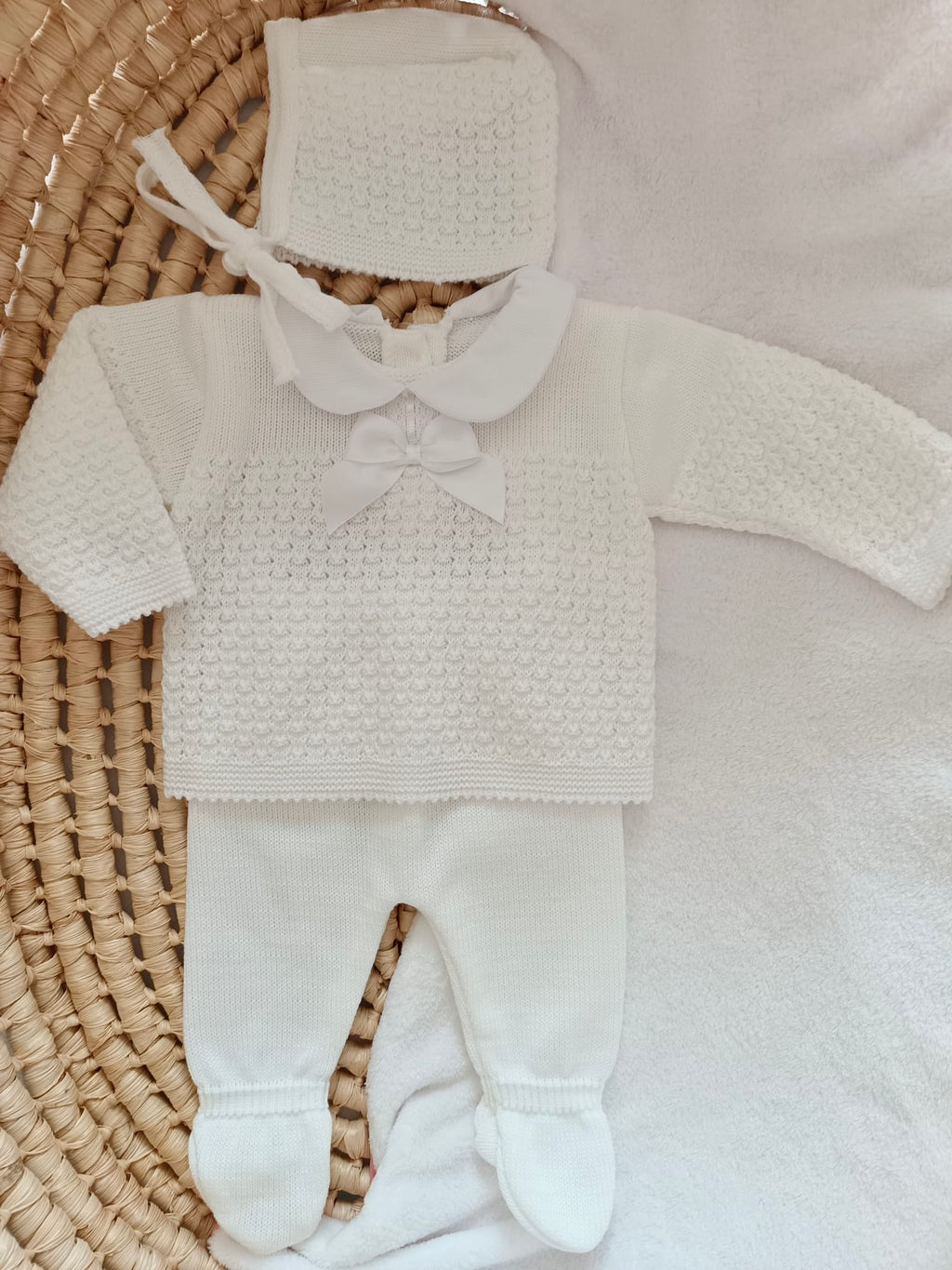 Ensemble complet naissance blanc 0/3 mois avec noeud satiné blanc