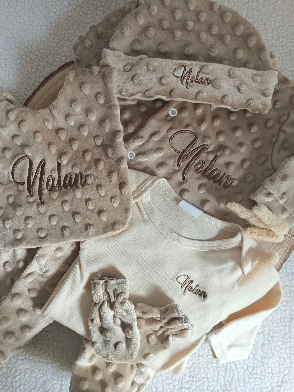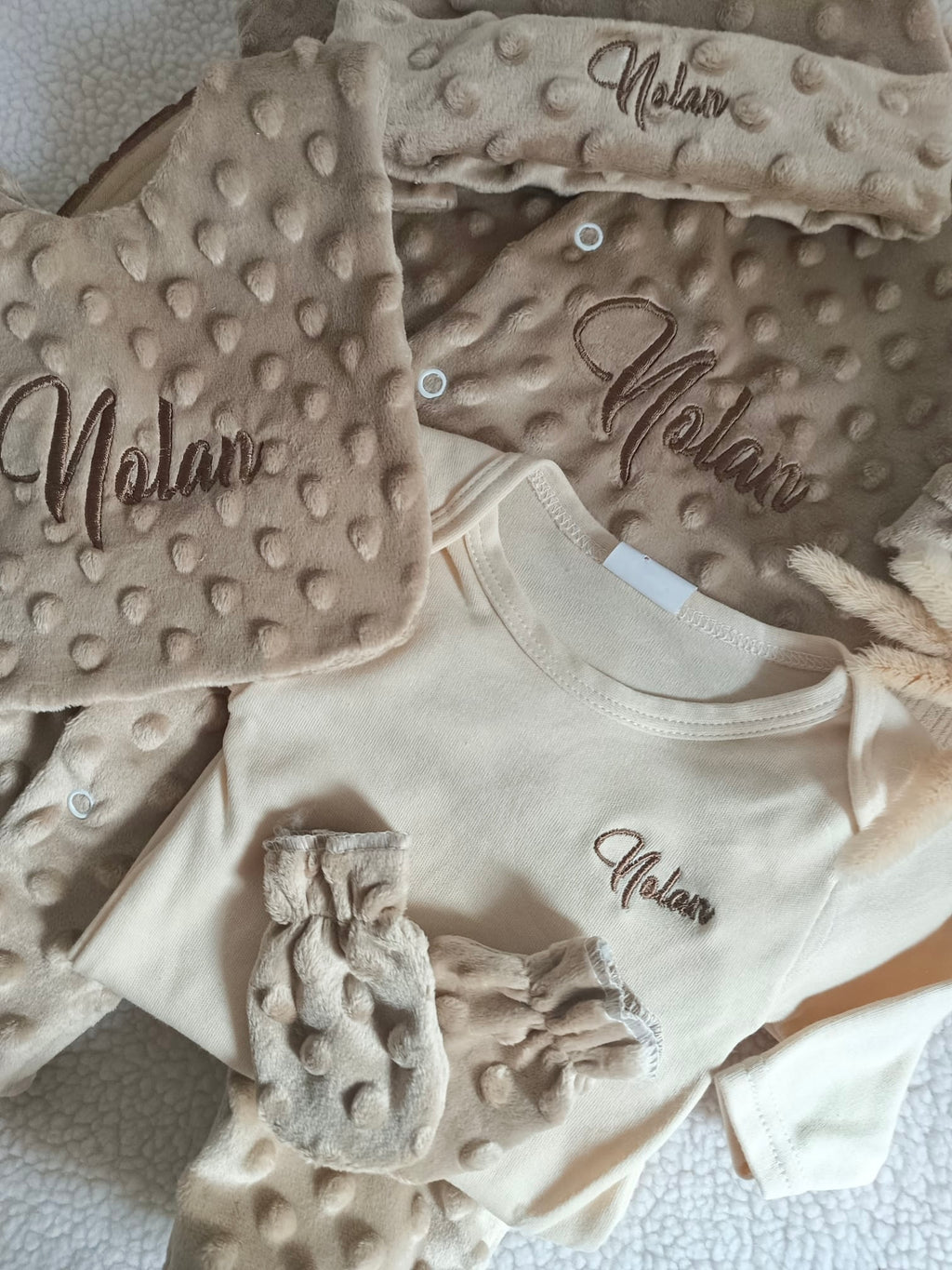 Notre ensemble complet pyjama minky et coton 5 pièces est spécialement conçu pour les premiers mois de bébé, offrant douceur et confort. Composé d’un bonnet, d’un bavoir, d’un pyjama, d’un body et d’une paire de gants, cet ensemble est parfait pour accompagner bébé dès la naissance (taille 0/3 mois). Pour un cadeau unique et personnalisé, nous proposons une option de broderie sur le bonnet, le bavoir, le pyjama et le body. Fabriqué avec des matières de qualité, il est en 100 % coton pour le body et 100% polyester pour le reste. Disponible en plusieurs couleurs, cet ensemble allie confort et élégance pour un petit look douillet au quotidien.