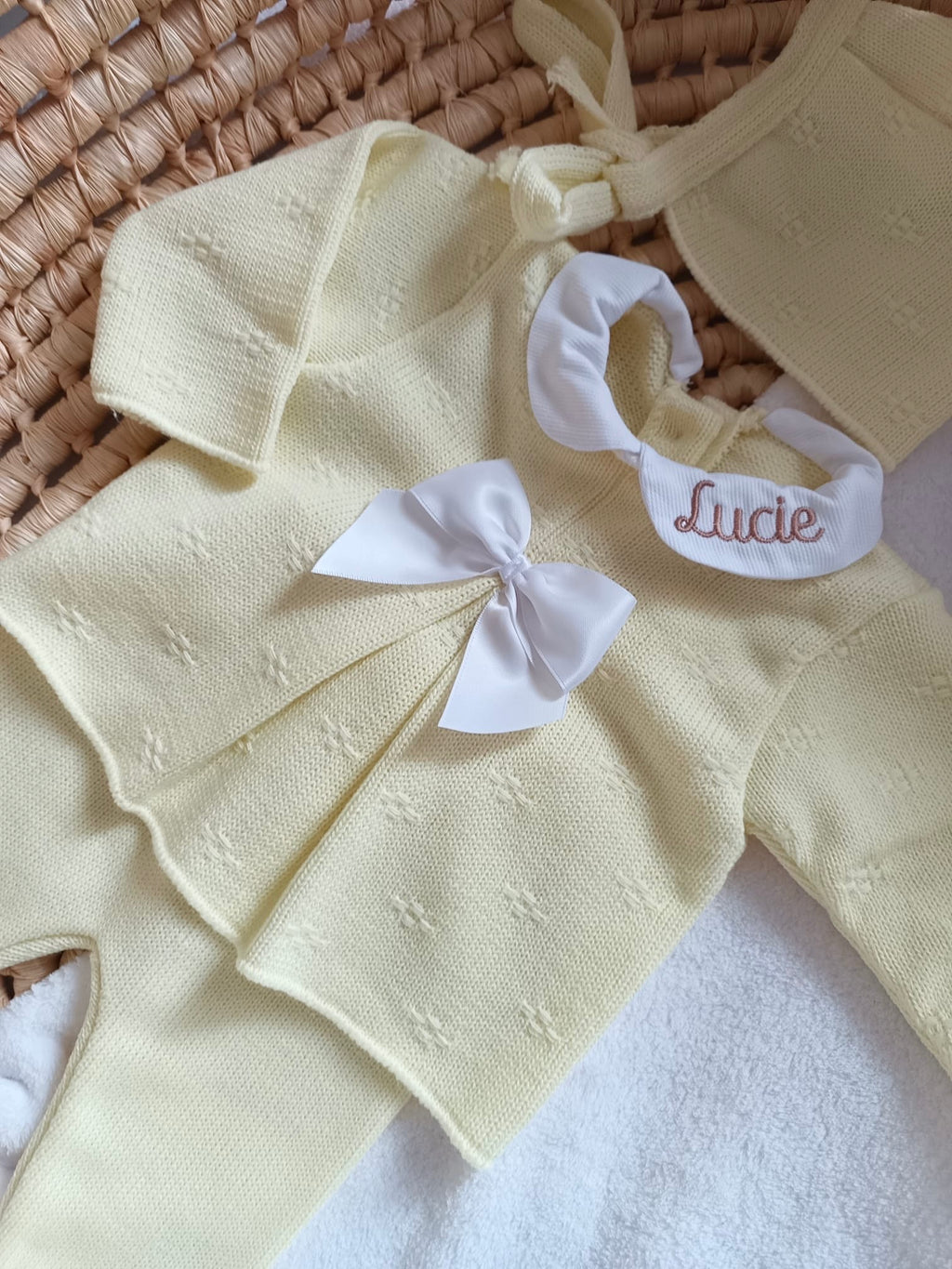 Ensemble complet jaune avec noeud satiné blanc 0/3 mois